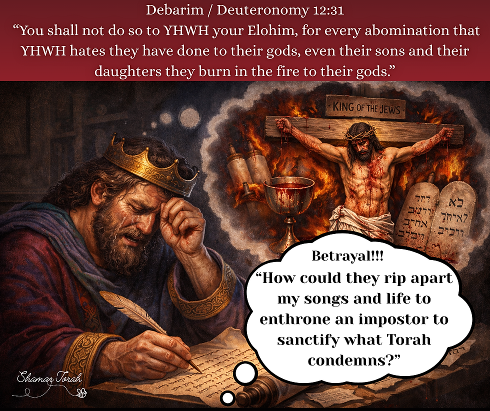 This misreading continues today by manipulating David’s writings and attributing them to a Jesus/Yeshua figure who violates everything promised to David and all that David represents. Abandonment, exile, and eventual restoration map cleanly onto David’s documented life (1 Samuel 19–26; Psalm 13; Psalm 30), and are also written prophetically for the last days, when David’s reputation is restored in its proper context-firmly dismantling the human sacrificial narratives wrongly attached to his psalms. These texts are not predictive riddles detached from their speaker. They are covenantal testimony spoken by the anointed king himself, echoing throughout time.